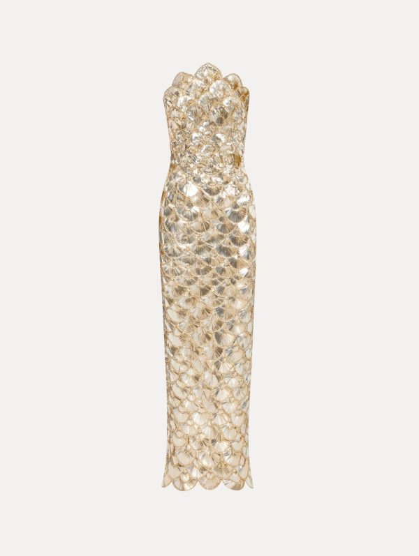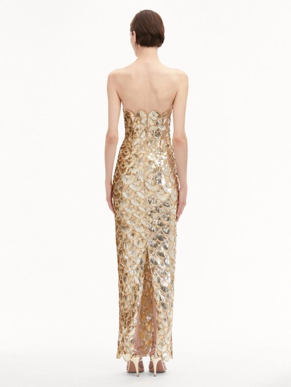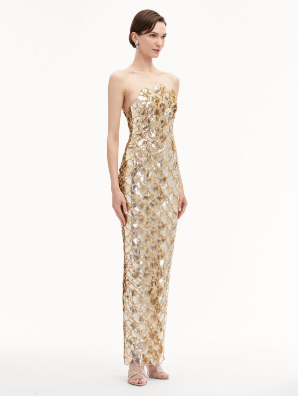 Experience show-stopping elegance with metallic sequin embroidery that cascades into a breathtaking architectural scallop design on this sophisticated column gown. The strapless neckline and streamlined silhouette create a timeless, red-carpet worthy look that embodies the iconic glamour Oscar de la Renta is celebrated for.