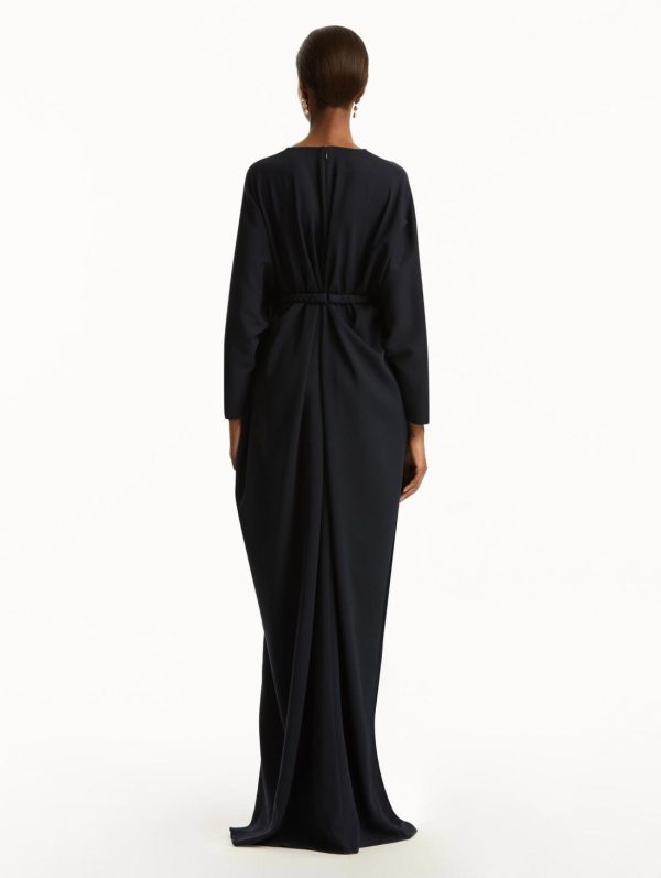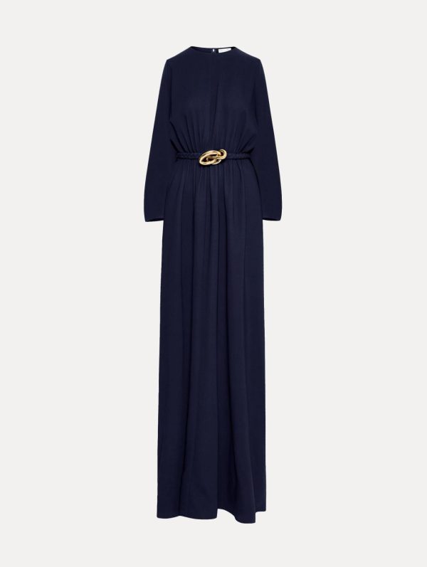 Crafted from luxurious heavy silk stretch georgette, this exquisite caftan offers effortless drape with long sleeves and a gracefully flowing silhouette that radiates sophisticated elegance. The signature sculptural gold-tone knotted belt beautifully defines the waist, creating a polished finishing touch that elevates your ensemble.