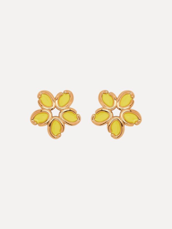 Elevate your style with these exquisite Oscar de la Renta earrings that showcase the iconic ‘O’ emblem transformed into an elegant floral design. Perfect for making a sophisticated statement, these vibrant yellow enamel earrings are ideal for showcasing with updos and special occasion hairstyles.