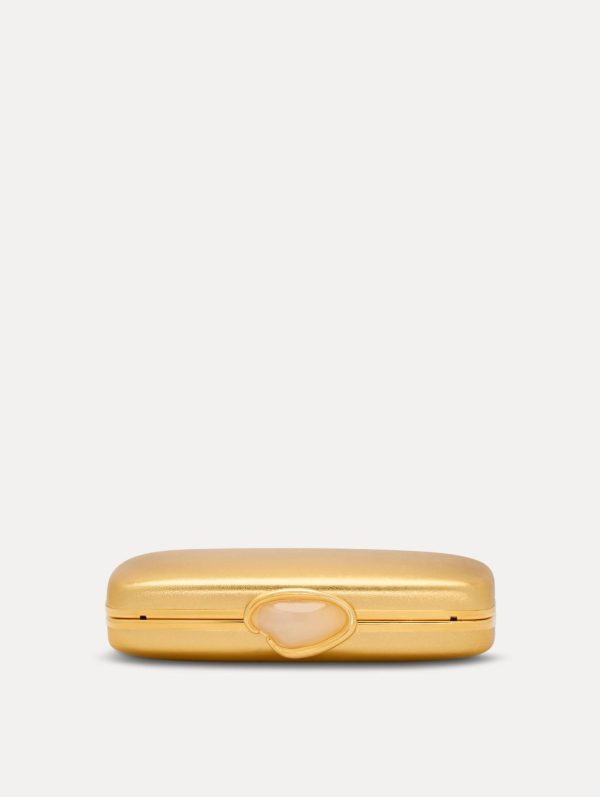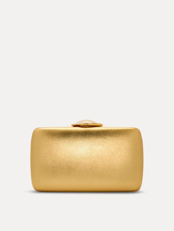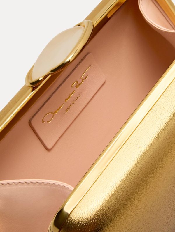 Elevate your evening ensemble with this sophisticated structured handbag that makes a stunning statement. Crafted from luxurious metallic Nappa leather, it features Oscar de la Renta’s signature ‘O’ emblem with a polished resin cabochon at the clasp—a distinctive mark of the brand’s exceptional craftsmanship. The versatile gold-tone detachable chain strap allows you to effortlessly transform this piece from an elegant shoulder bag to a chic clutch for any formal occasion.