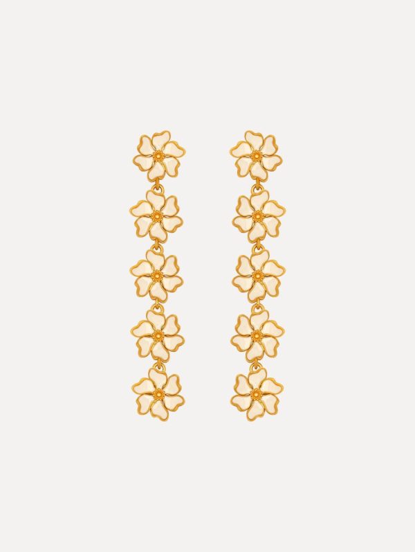 Elevate your style with these exquisite enamel drop earrings featuring a graceful cherry blossom design. Crafted with precision, the gold-tone metal setting showcases a delicate cascade of blossoms, each petal finished in a sophisticated ivory hue. Perfect for completing your look with the matching ring.
