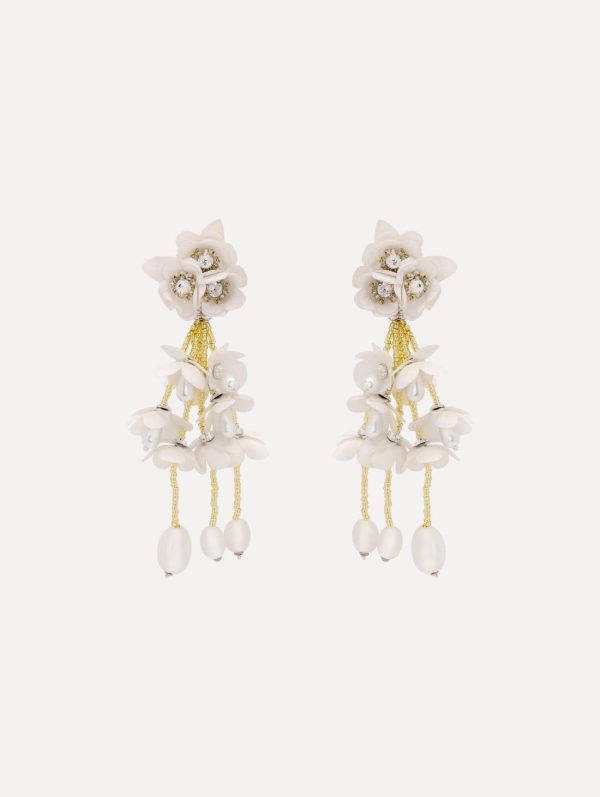 Experience the art of floral elegance with these exquisite drop earrings, where tonal petals create a beautiful gradient effect enhanced by delicate beaded fringe. The sophisticated white drops add graceful movement and dimensional texture, bringing a touch of garden-inspired charm to any ensemble.