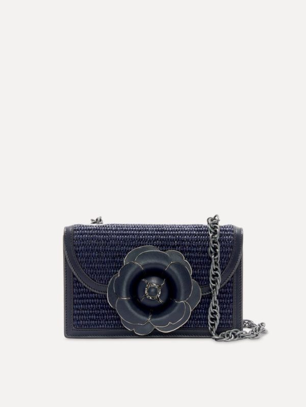 Experience the perfect fusion of artisanal craftsmanship and modern elegance with this redesigned TRO handbag for Pre-Fall 2024. Expertly constructed from woven raffia and accented with sophisticated beige saffiano leather, this stunning piece features a versatile detachable chain shoulder strap for multiple carrying options. The showstopping custom-designed metal-trimmed gardenia appliqué makes a bold statement at the front, transforming this bag into your go-to accessory for everything from daytime outings to evening events.
