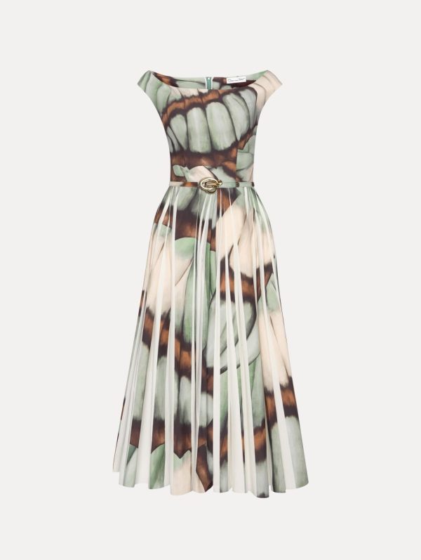 This stunning dress features a captivating abstract butterfly print that creates a beautiful sense of movement and elegance. Expertly crafted with delicate pleating that reveals subtle glimpses of crisp white, creating dimension and visual interest.