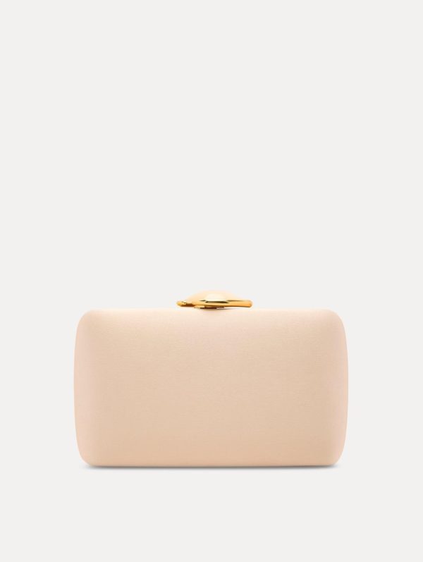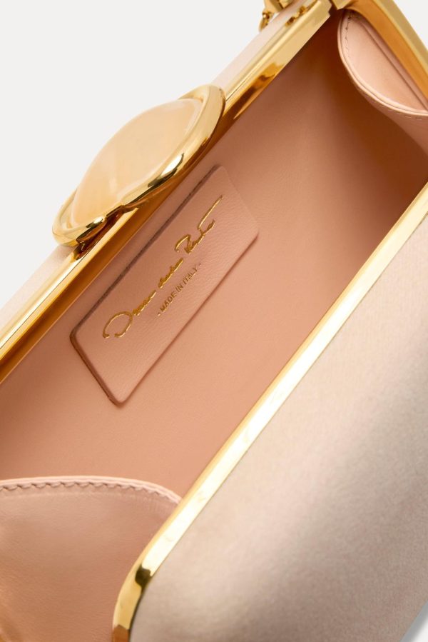 Elevate your evening ensemble with this exquisitely crafted minaudière featuring a sophisticated structured design. Sheathed in premium satin with a lustrous finish, this elegant piece showcases the signature Oscar de la Renta ‘O’ emblem accented with a refined resin cabochon at the clasp—a distinctive hallmark of the brand’s luxury heritage. The versatile gold-tone detachable chain link shoulder strap allows seamless transformation from shoulder bag to clutch for multiple styling options.