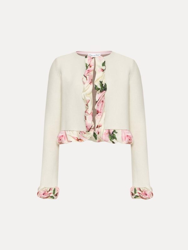 Rendered in a soft ecru hue, this exquisite cardigan features an elegant bubble twist trim adorned with delicate cherry blossom prints. The intricate detailing creates a romantic aesthetic that elevates the timeless silhouette, beautifully merging texture with artistic design.