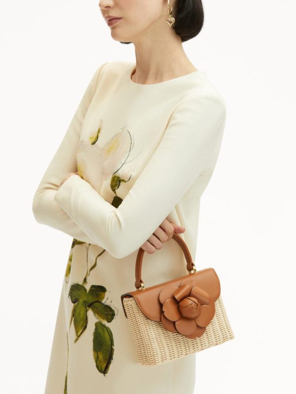 Experience effortless sophistication with this meticulously crafted handbag, featuring artisanal hand-woven wicker construction that delivers both style and durability. The elegant design is enhanced with premium calfskin accents and a distinctive sculptural gardenia appliqué that adds a touch of artistic flair. Designed for modern versatility, this bag seamlessly transitions from daytime elegance to evening sophistication with its structured top handle and convertible chain-link shoulder strap.