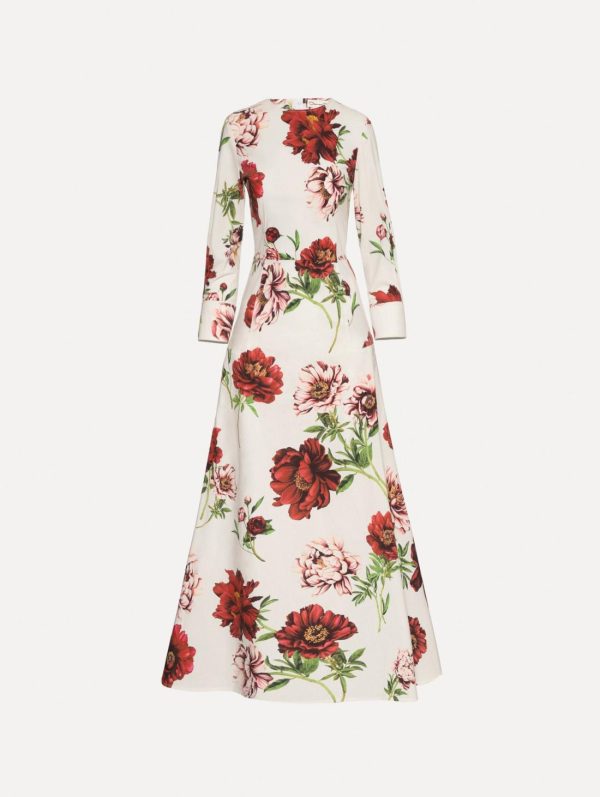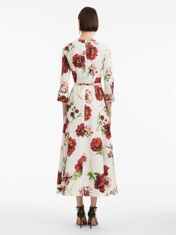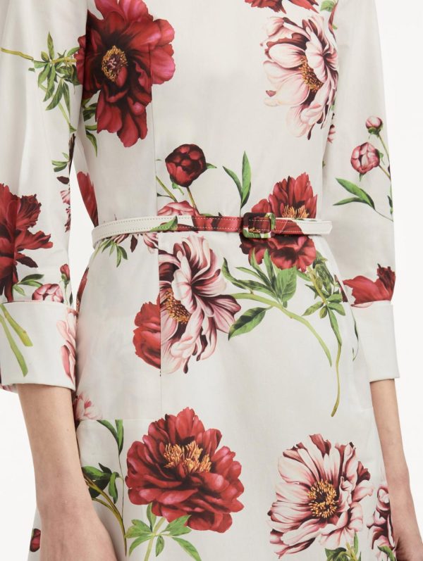 Featuring a stunning blooming peony print, this cotton poplin dress showcases timeless floral elegance perfect for sophisticated daytime wear. The flattering silhouette combines three-quarter-length sleeves with a self-belt design, creating a polished yet effortless look that transitions seamlessly from brunch to evening events.