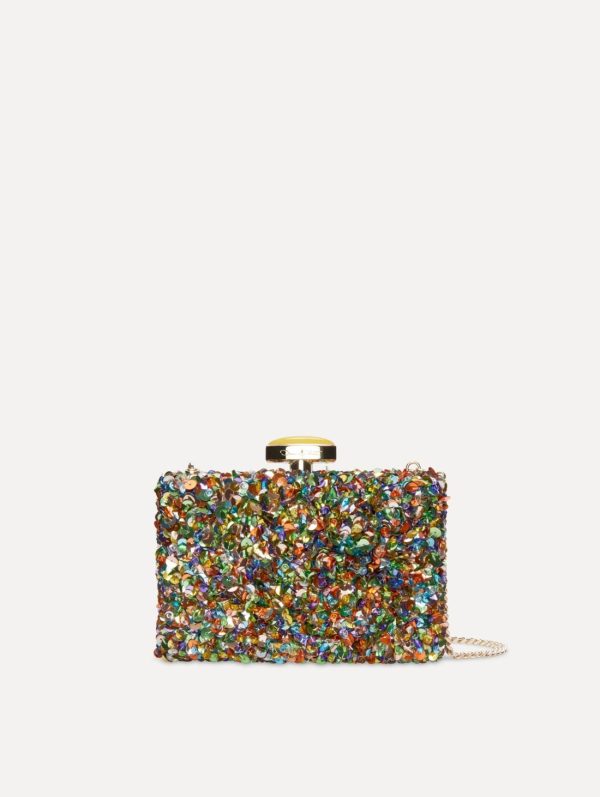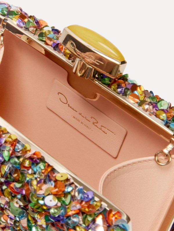 Make a stunning statement with this exquisite minaudière handbag featuring vibrant multi-colored sequin embroidery that captures the joyful spirit of celebration. The structured silhouette maintains its elegant shape while offering practical sophistication. Featuring a versatile gold-tone detachable chain strap, this piece seamlessly transforms from shoulder bag to clutch, perfect for both daytime elegance and evening glamour.