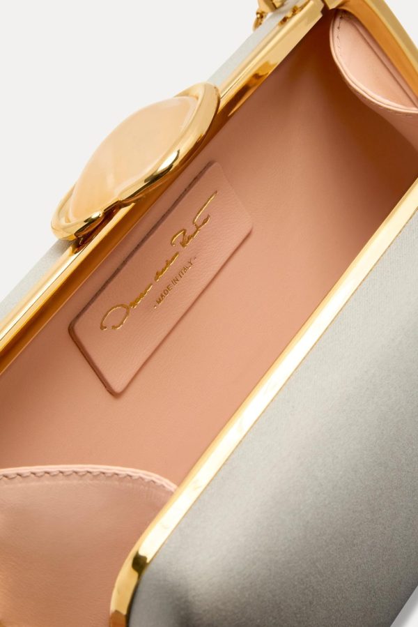 Elevate your evening ensemble with this exquisitely crafted handbag featuring a sophisticated structured design. Sheathed in premium satin with a lustrous finish, it showcases the signature Oscar de La Renta ‘O’ emblem and elegant resin cabochon at the clasp—a distinctive hallmark of the brand’s luxury heritage. The versatile gold-tone detachable chain strap allows seamless transformation from shoulder bag to elegant clutch for any formal occasion.