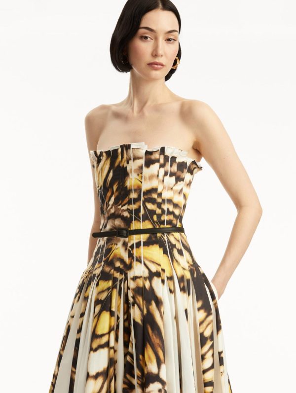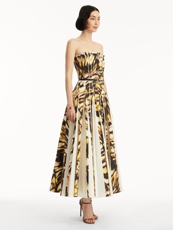 This stunning dress features a captivating abstract butterfly print that creates movement and visual interest with every step. Expertly crafted pleating reveals subtle glimpses of crisp white underneath, adding dimension and sophistication to the silhouette. The sculptural gold-tone knotted belt provides a luxurious accent that defines your waist for a flawless, polished finish.