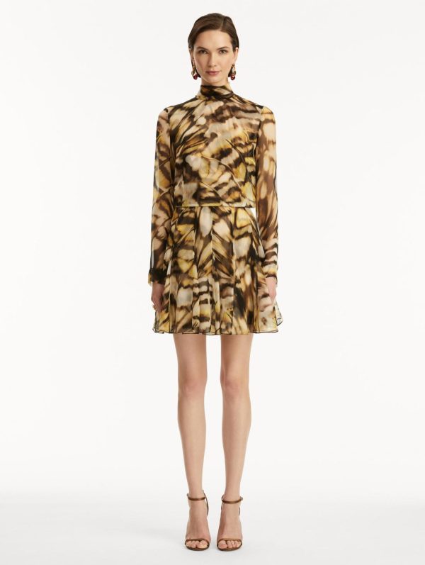 Transform your everyday style or special occasion look with this exquisite silk chiffon dress. Featuring a captivating abstract butterfly print that evokes the graceful movement of delicate wings, this elegant mini dress combines sophisticated design with luxurious comfort.