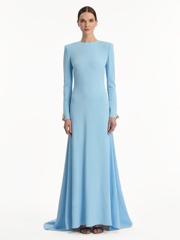 Expertly tailored from luxurious blue stretch cady, this sophisticated long-sleeve gown delivers timeless elegance with modern appeal. The dramatic keyhole back creates an unforgettable silhouette, while exquisite gold butterfly embellishments artfully adorn the sleeves and back—each meticulously crafted to appear in graceful motion.