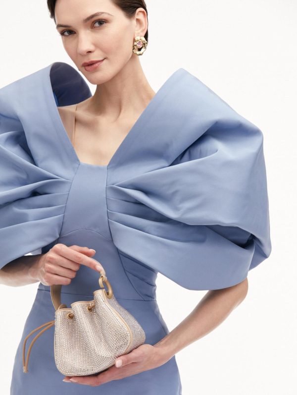 Elevate your evening ensemble with the exquisite O Handle Bag, featuring breathtaking all-over crystal pavé detailing on a luxurious champagne satin foundation. This meticulously crafted top handle silhouette offers versatile styling with its elegant drawstring fastening and convertible shoulder strap, making this mini bag the ultimate accessory that transitions effortlessly from daytime sophistication to nighttime glamour.