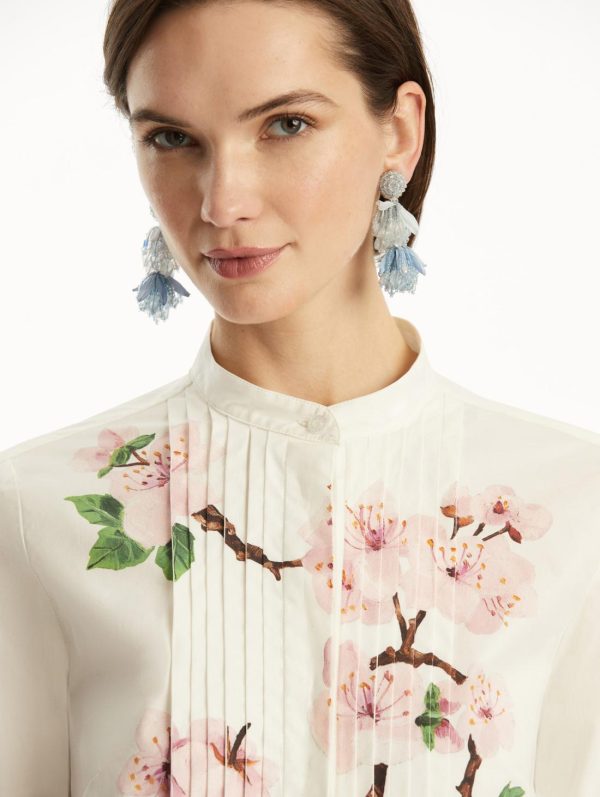 Experience timeless sophistication with this beautifully crafted blouse made from premium cotton poplin. The exquisite front pleating creates elegant dimension, while the delicate pink cherry blossom pattern adds a touch of feminine charm to the crisp white background. Featuring a structured banded collar and long sleeves, this piece offers polished refinement perfect for both professional settings and special occasions.