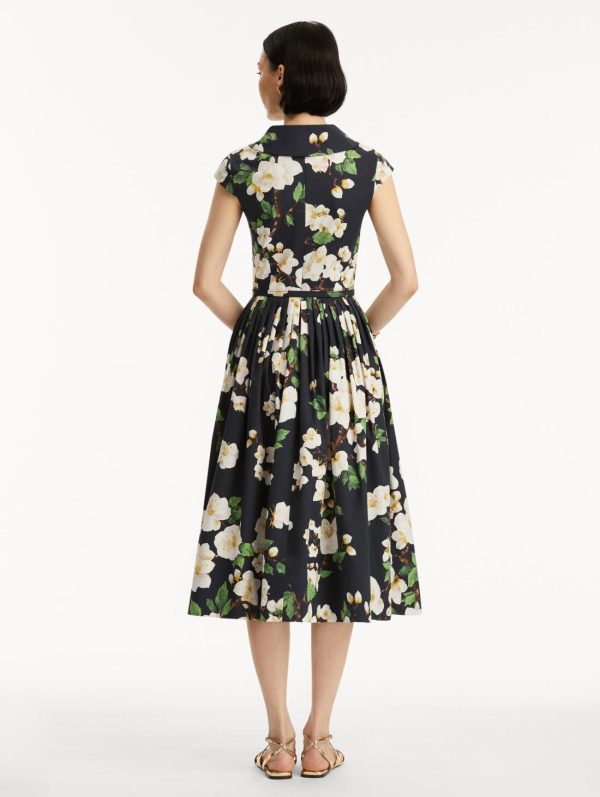 Experience effortless elegance with this stunning navy cotton poplin dress featuring an all-over cherry blossom print that captures timeless femininity. The exaggerated spread collar with a delicate bow tie adds sophisticated vintage charm, while the softly pleated skirt creates graceful movement with every step. Lightweight cap sleeves provide a breezy, comfortable feel perfect for warm-weather occasions.