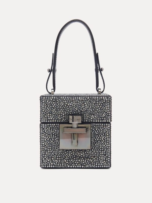 Elevate your evening ensemble with this stunning crystal-embellished clutch featuring a sophisticated graphite satin base and architectural cube design. The signature logo-engraved lock clasp adds a touch of luxury, while the versatile detachable chainlink strap transitions effortlessly from shoulder carry to elegant top handle for day-to-evening versatility.