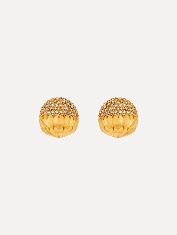 Exquisitely sculpted into gilded artichoke forms, these stunning earrings capture the signature motif from the season’s ready-to-wear collection. Each piece showcases meticulous craftsmanship with brilliant pavé crystal detailing that catches the light beautifully.