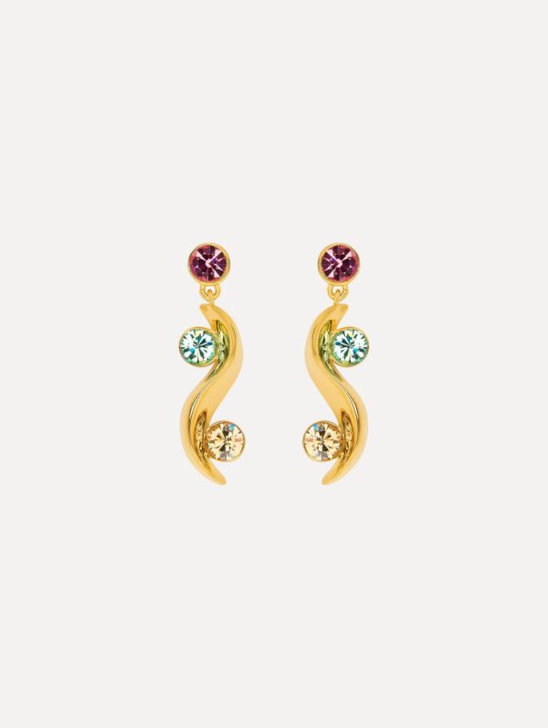 These stunning earrings showcase a gold-tone wave design elegantly suspended from a single brilliant crystal, creating captivating movement with every turn. Adorned with sparkling crystals along the graceful curve, this sculptural statement piece adds sophisticated glamour to any ensemble.