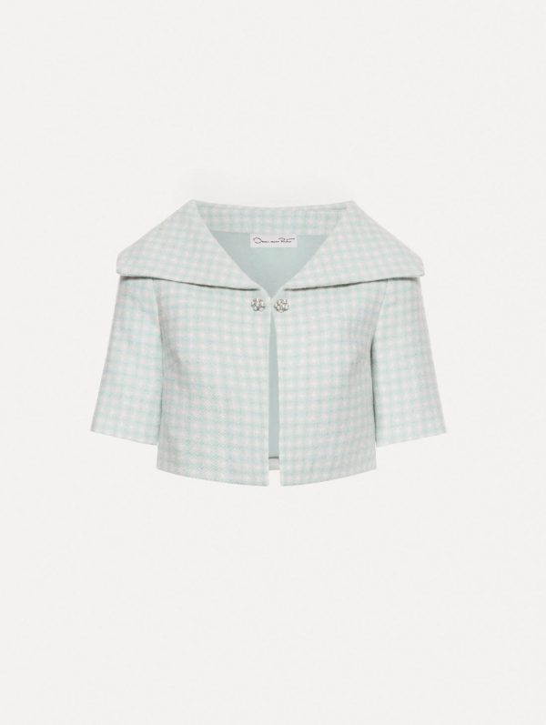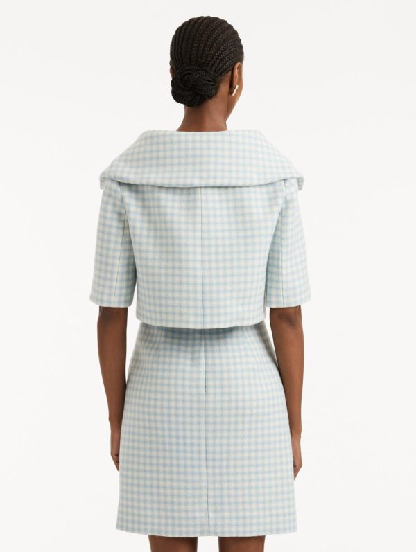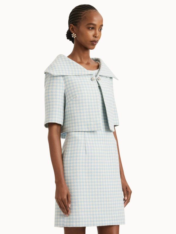Experience sophisticated style with this beautifully crafted checked wool tweed jacket, featuring a delicate blend of light blue and ivory tones that elevate your timeless wardrobe. The contemporary cropped silhouette and short sleeve design deliver a polished, structured look that transitions effortlessly from day to evening.