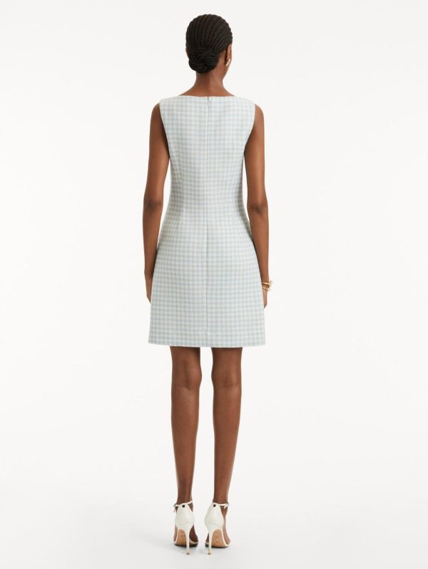Experience timeless elegance with this exquisite checked wool tweed dress, crafted in sophisticated light blue and ivory tones that elevate your professional wardrobe. The sleeveless design and graceful scoop neckline create a polished, structured silhouette perfect for sophisticated occasions.