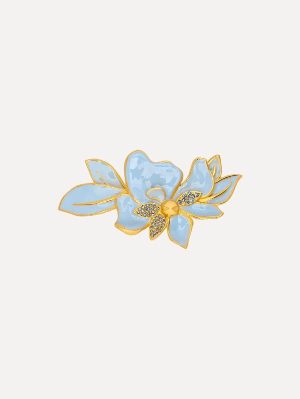 Elevate your style with this exquisite jasmine-inspired brooch, featuring radiant light blue enamel petals accented with luxurious gold framing and a dazzling crystal-cluster center that captures the light beautifully.