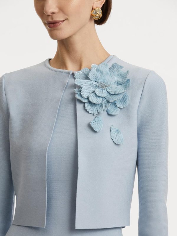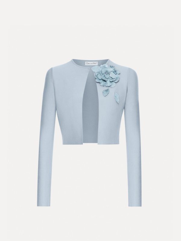 Elevate your wardrobe with this beautifully crafted overlayer in a serene light blue hue, featuring a contemporary cropped silhouette. Delicate sequin peony appliqués grace the neckline, creating an elegant shimmer effect that adds a romantic touch to this sophisticated design.