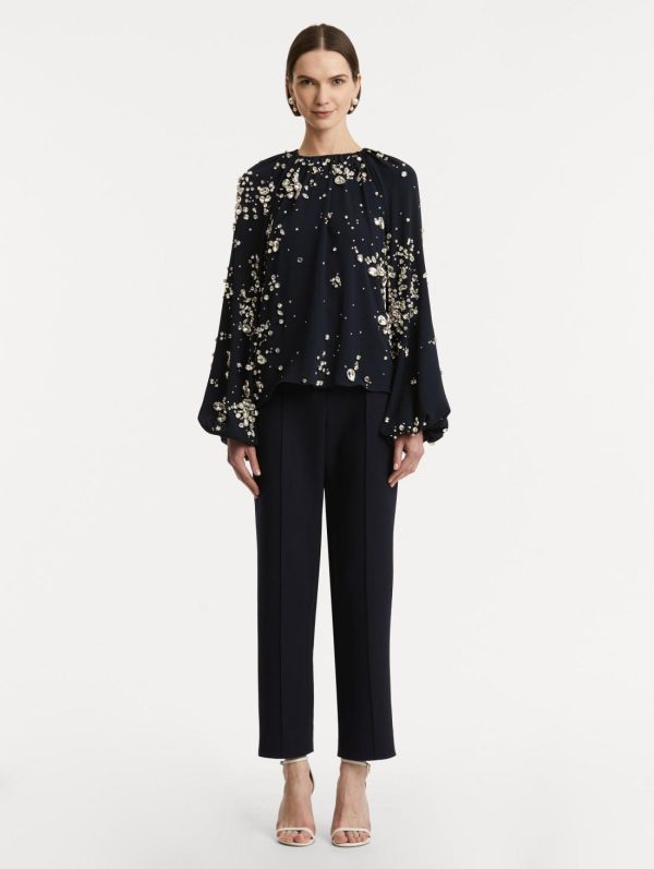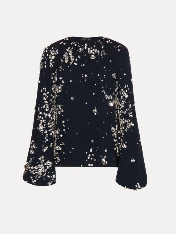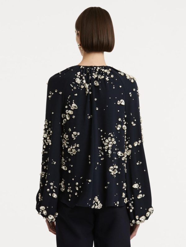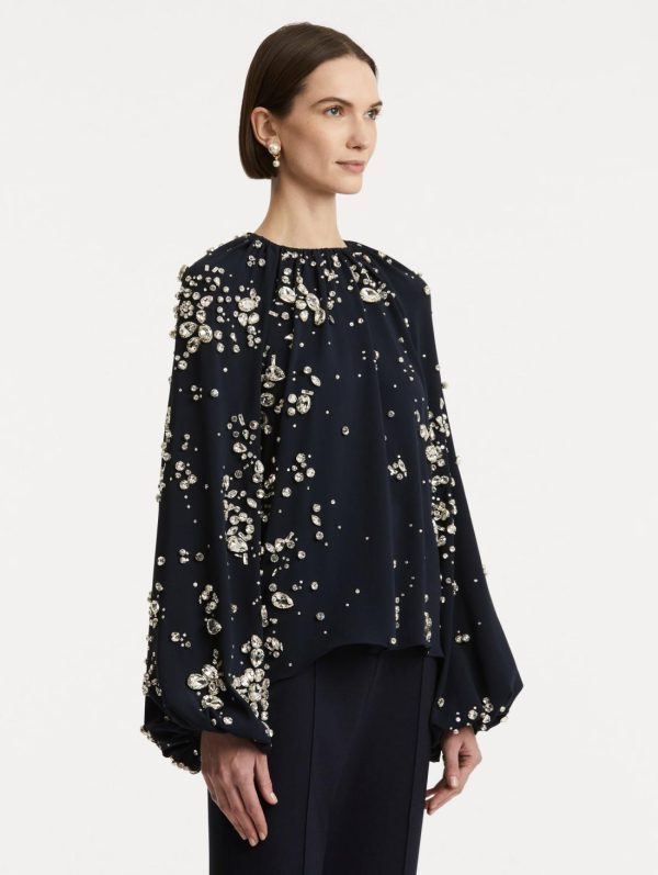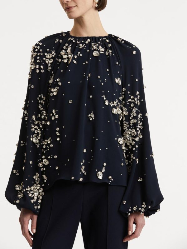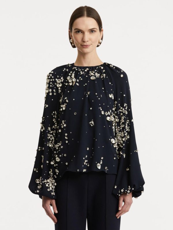 Experience celestial elegance with multi-dimensional crystal clusters artfully scattered across a deep navy silk canvas, creating a mesmerizing shimmer that moves with you. This exquisite blouse features dramatic balloon sleeves that make a sophisticated statement.