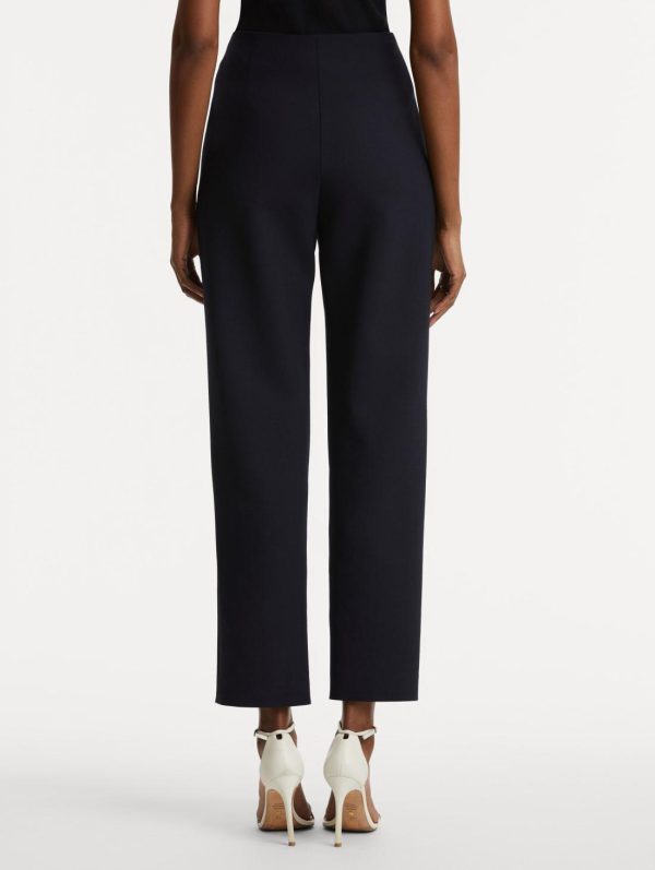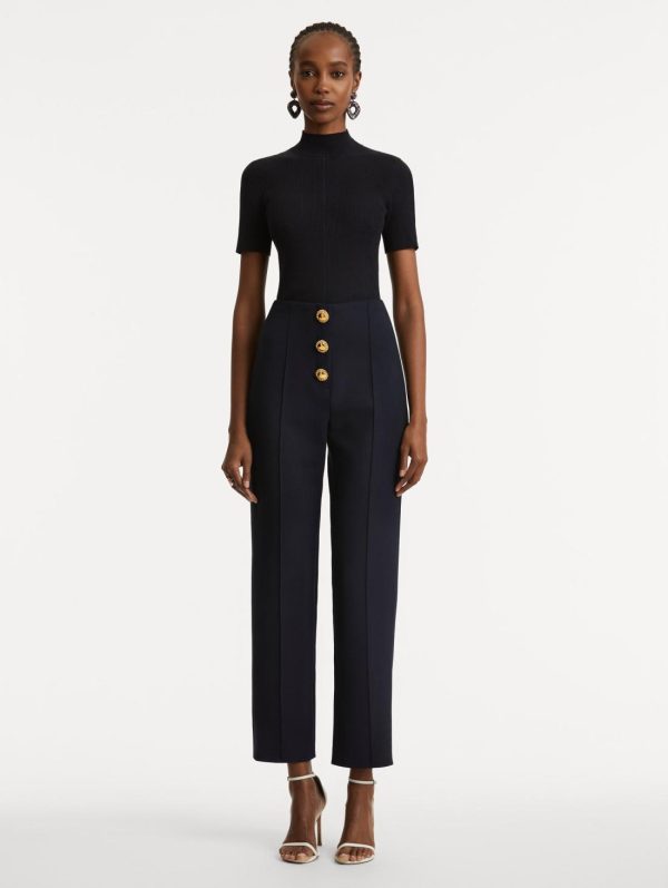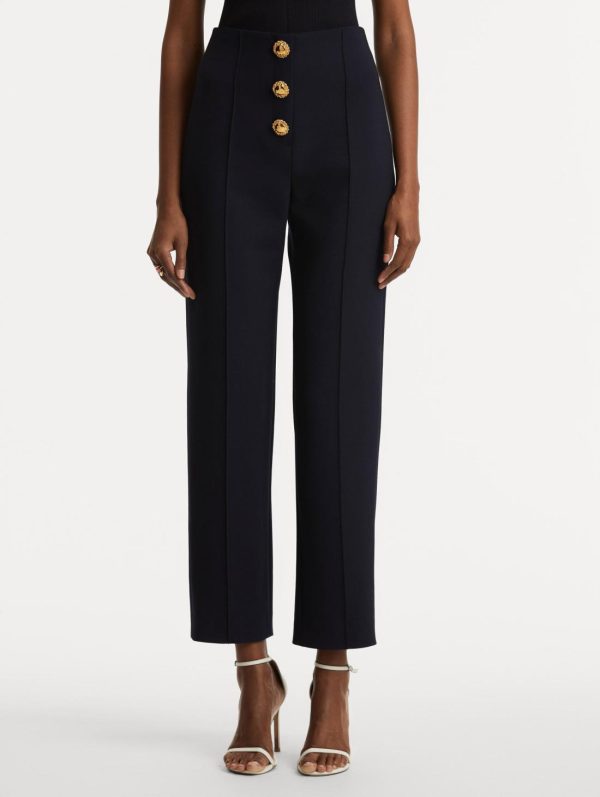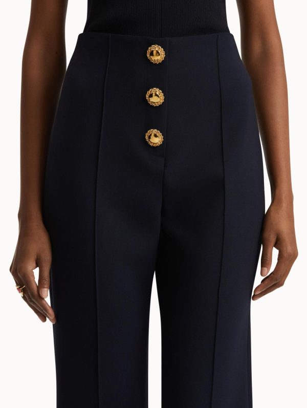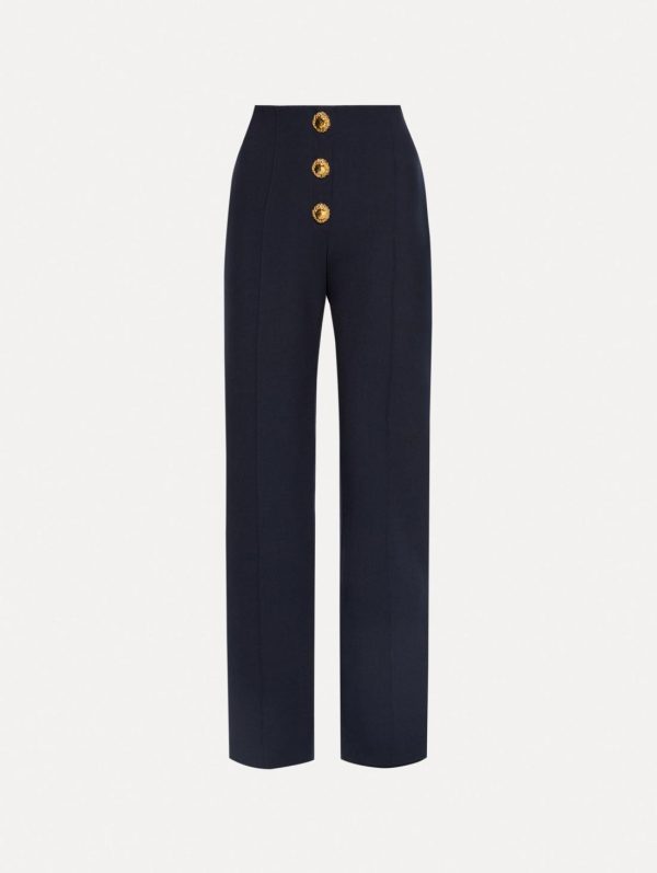 Expertly tailored from premium stretch wool, these sophisticated high-waisted pants feature elegant pintuck seams that create a beautifully elongated silhouette. The signature trio of sculptural gold buttons at the waist adds a luxurious designer touch, while the tapered leg delivers a contemporary polished look. The soft blue hue offers a modern refresh to traditional tailored trousers, perfect for both professional settings and elevated casual wear.