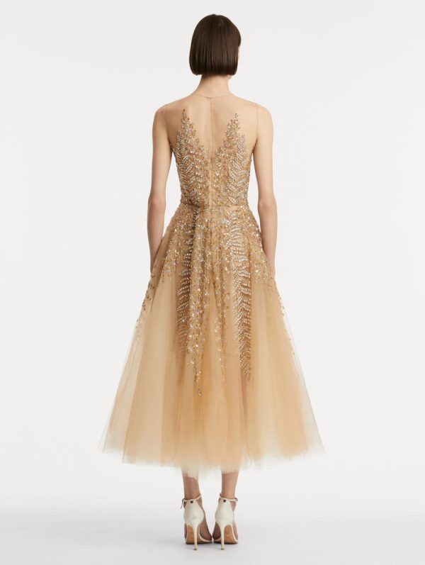 Experience captivating elegance with this exquisite cocktail dress featuring intricate metallic fern embroidery that creates a stunning play of light and texture. The illusion tulle base and softly flared skirt deliver a sophisticated silhouette perfect for special occasions.