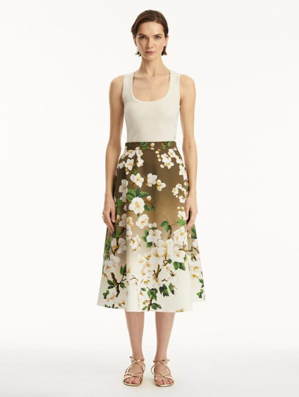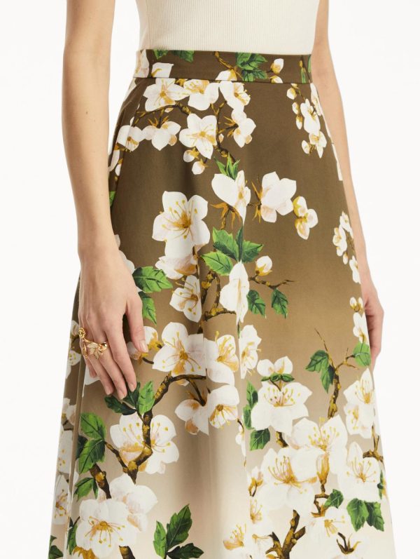 Experience effortless elegance with this cotton poplin skirt featuring a beautiful ombré fade from khaki to white, adorned with delicate cherry blossom prints that create a romantic, nature-inspired statement piece perfect for any occasion.