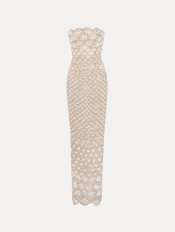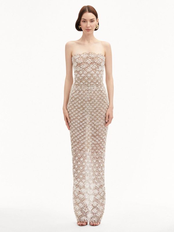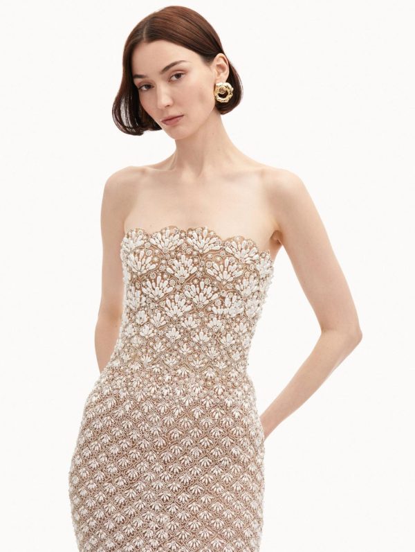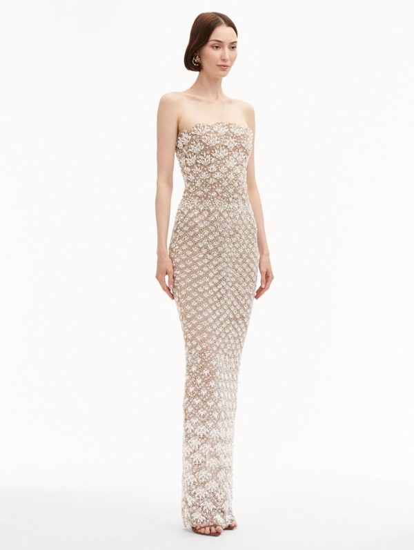 Exquisite pearl embroidery radiates outward to form a stunning architectural scallop pattern across this elegant column gown. Featuring a sophisticated strapless neckline and sleek silhouette, this masterpiece captures the iconic glamour that defines the Oscar de la Renta legacy.