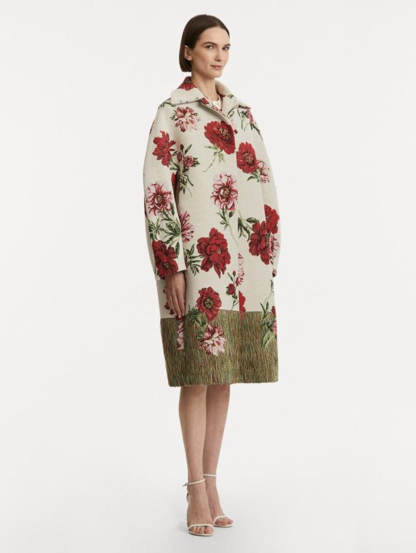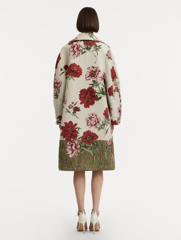 This statement-making oversized jacquard coat showcases a breathtaking tree peony motif in full bloom, with vibrant floral patterns artfully woven throughout its generous silhouette. The hem features intentionally unraveled threads that create a beautifully organic, garden-inspired fringe detail.