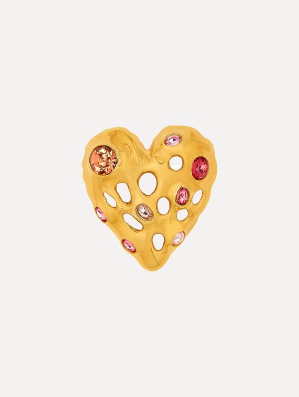 This exquisite brooch showcases a beautifully textured heart design adorned with sparkling European glass crystals in varying sizes. The intricate cutout details and dimensional finish create a sophisticated statement piece that catches the light elegantly.